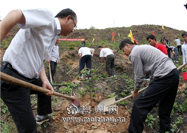 在植樹現(xiàn)場,三一重工、正源華茶、金森林等在梅投資企業(yè)的負(fù)責(zé)人,不停地?fù)]鋤挖穴、填土,然后澆水,仔細(xì)地栽下一棵棵樹苗。一個(gè)上午,他們就種下木荷、蔭香、山杜鵑等1000多株樹苗,為整個(gè)山坡添上一層新綠。